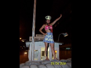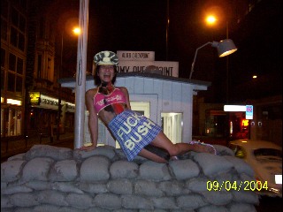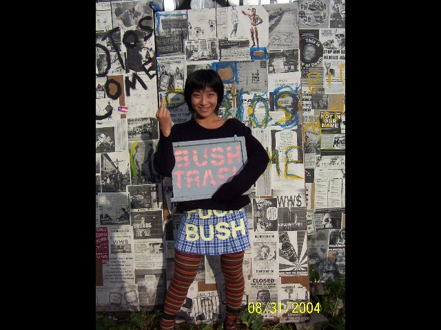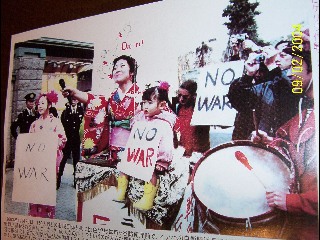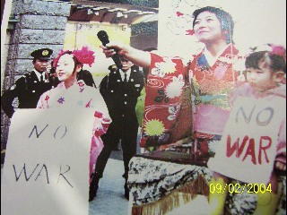 In March 2003 , just before the attack on Iraq, she protested with a group of people in a spectacular way against the coming war and the involvement of JapanThe "Pink Guerillas" were born a new kind of demonstation - young women in pink bikininis roamed the streets of Tokyo with artists, street performers etc.